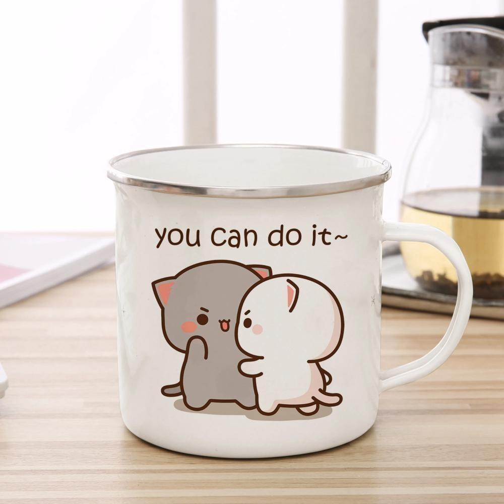 كوب قهوة وشاي من المينا بتصميم لطيف يجمع بين الخوخ وشخصية غوما القط، مثالي لمحبي الحيوانات. يتميز بمظهر جذاب يناسب الإفطار، الحلوى، الحليب، والماء. هدية رائعة للأزواج أو عشاق التصاميم اللطيفة والمميزة.